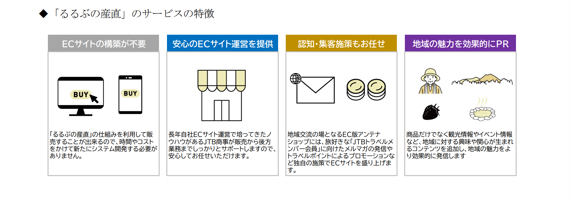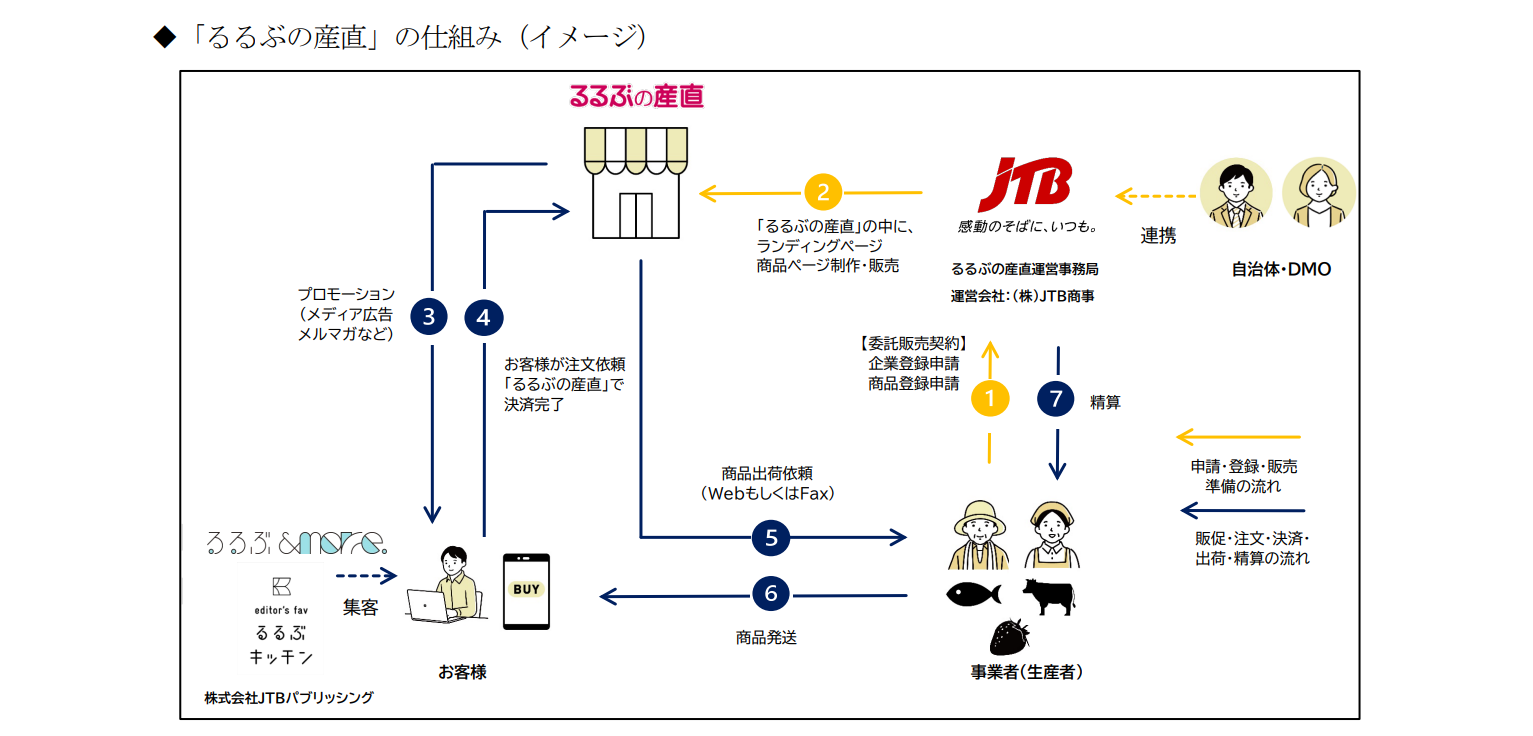 地域の特産品取扱事業者の人手不足による新たな集客・認知拡大、収益確保への対応が難しいなどの課題解決を目的に、株式会社 JTB パブリッシングと連携し「るるぶの産直」を通じて、DMO や地方自治体、観光協会等の地域ユニットとの関係構築を図りながら、単なる物販にとどまらない地域の魅力を伝えながら、地域経済の活性化と、お客様への新たな価値提供を目指してまいります。