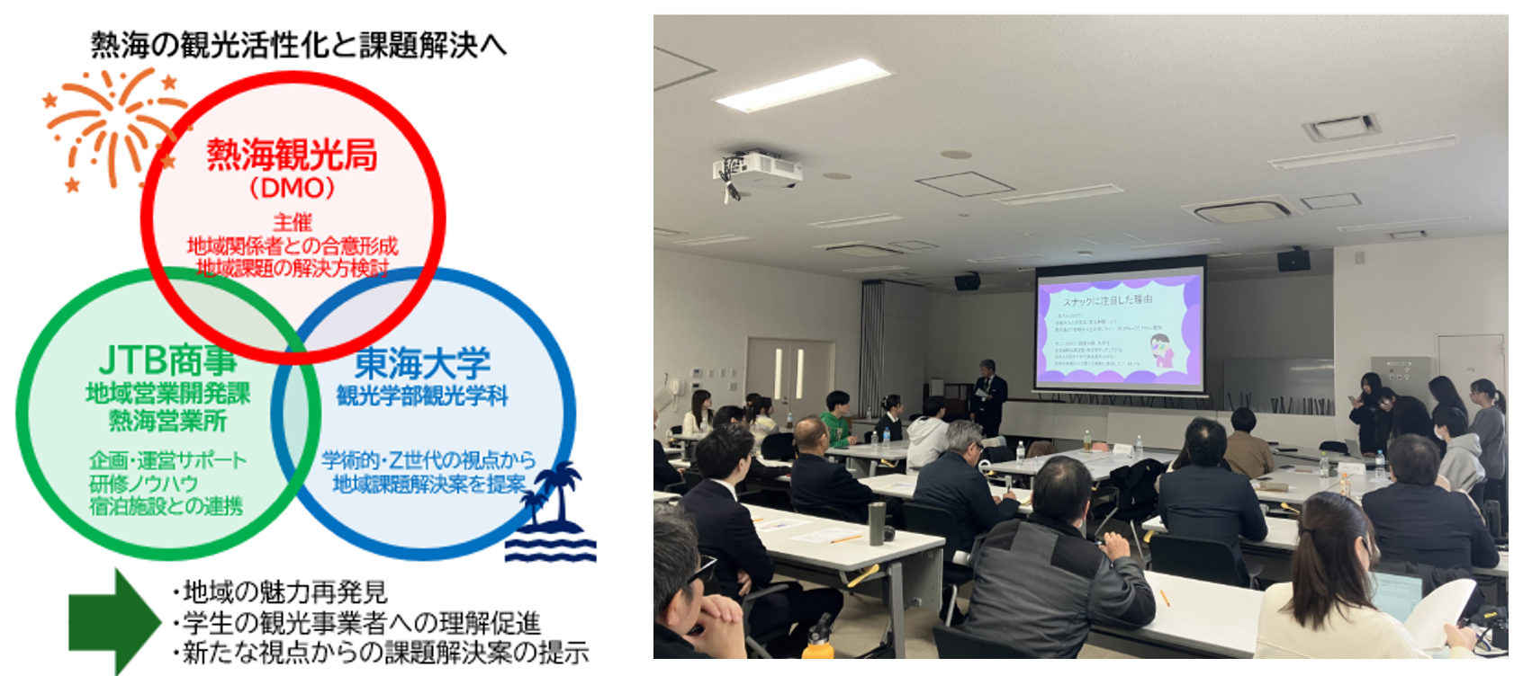 JTBグループで全国の宿泊施設等にソリューションや各種商材を提供している株式会社JTB商事(本社:東京都中野区 代表取締役 社長執行役員:加藤雄次)は、2025年11月16〜17日・12月14日の計3日間、主催の一般財団法人熱海観光局(DMO)と連携し、東海大学観光学部観光学科の服部泰ゼミ生16名、熱海市内の宿泊事業者、まちあるきガイドらの協力を得て、熱海市が抱える地域課題をテーマとした産官学連携プロジェクト研修を熱海市内で実施しました。