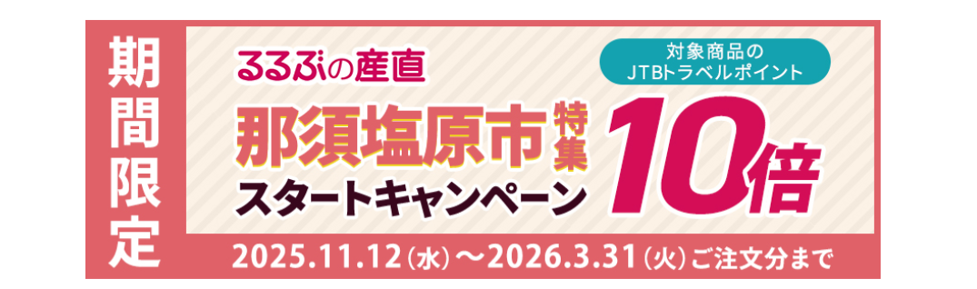 那須塩原市特集ページに記載の商品を購入されたお客様に、トラベルポイント 10 倍プレゼントキャンペーンを実施します。※2026 年 3 月 31 日ご注文分まで
